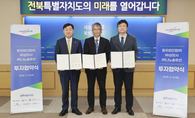 전북특별자치도는 14일 군산시, 익산시와 함께 동우화인켐㈜, ㈜삼양사, ㈜나노솔루션과 847억 원 규모의 투자협약을 체결했다.