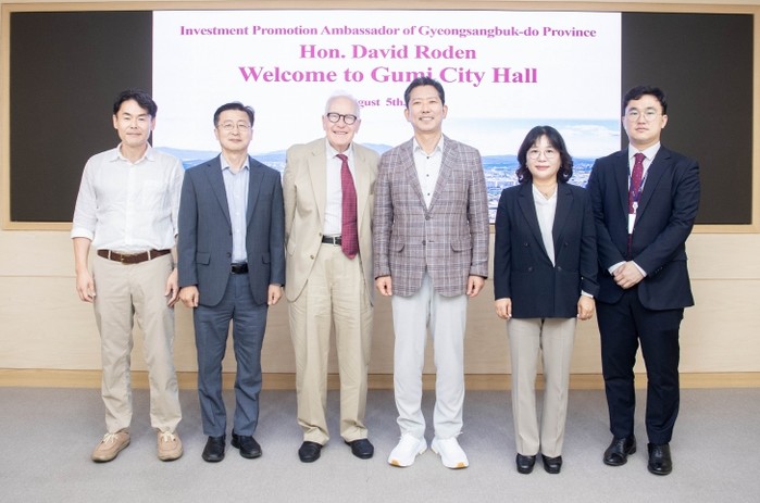 김장호 구미시장은 5일 시청 국제통상협력실에서 ‘데이비드 로든(David Roden) 경상북도 투자유치 홍보대사(이하 홍보대사)’를 접견하고, 구미시 투자환경을 소개하며 협력을 요청했다.