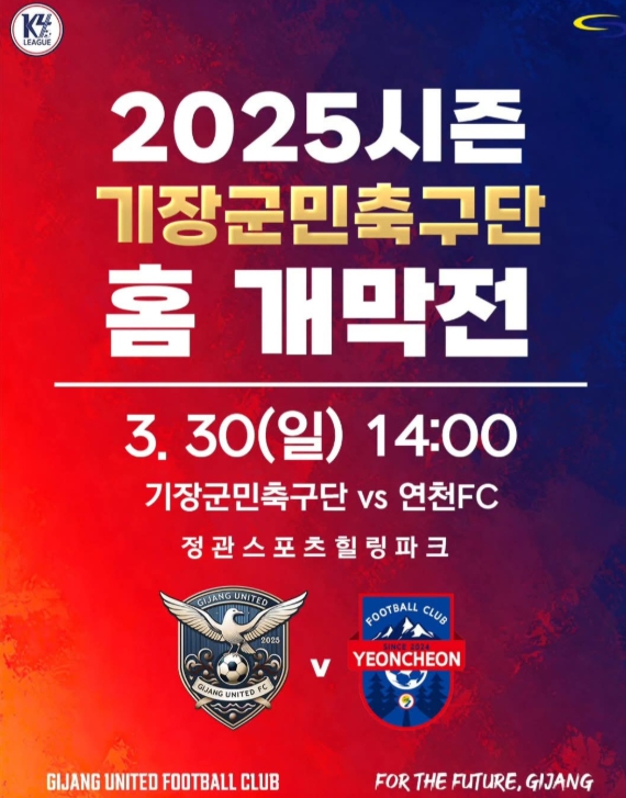 기장군은 오는 30일 일요일 오후 2시 정관스포츠힐링파크에서기장군민축구단의 2025년 K4리그 홈 개막전이 열린다고 28일 밝혔다.