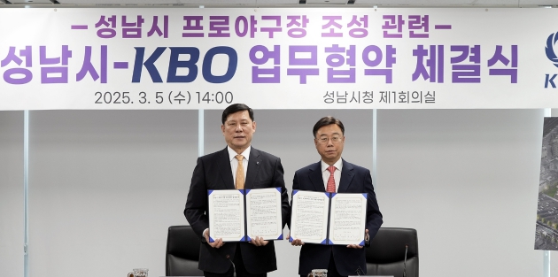 KBO 허구연 총재와 신상진 성남시장은 5일(수) 성남시 종합운동장을 야구전용구장으로 개조하는 등 프로야구 경기 개최를 위한 성남시 야구전용구장 조성 MOU를 체결했다.