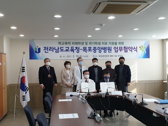 [전남=프레스뉴스] 강래성 기자= 전라남도교육청(교육감 장석웅)이 2월 18일(목) 목포중앙병원 별관에서 목포중앙병원(원장 이승택)과 학교폭력 피해학생 및 위기학생 치료전담기관 운영을 위한 업무협약을 체결했다.