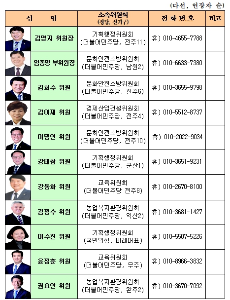 ▲ 제12대 전북특별자치도의회 제4기 예산결산특별위원회 위원 명단 |