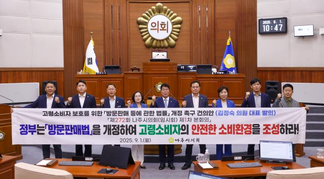 나주시의회는 김정숙 의원이 발의한 ‘고령소비자 보호를 위한 '방문판매 등에 관한 법률'개정 촉구 건의안’을 1일 열린 제272회 나주시의회(임시회) 제1차 본회의에서 의결했다.