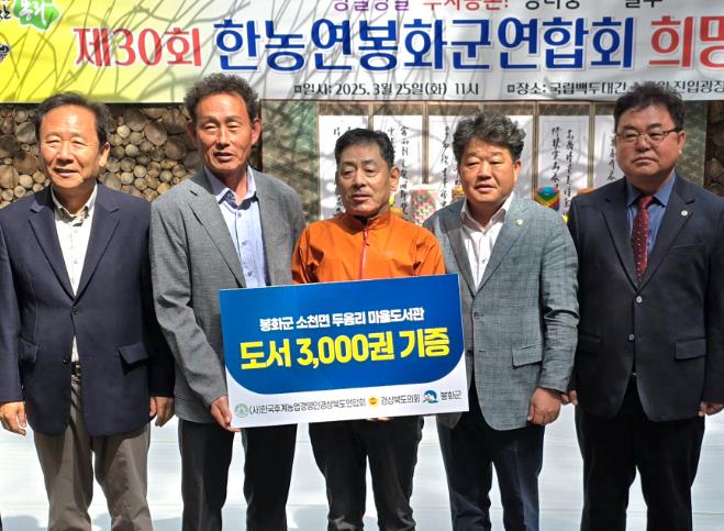 경상북도의회와 한국농업경영인 경상북도연합회는 3월 25일 국립백두대간수목원 광장에서 열린 ‘한농연봉화군연합회 희망풍년기원제’ 행사에 앞서, 봉화군 소천면 두음리 어린이들에게 각계에서 기증받은 아동도서 3,200여 권을 전달했다.