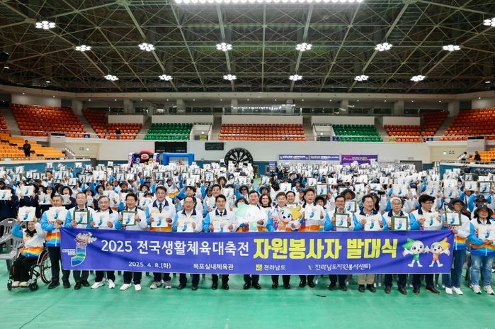 김태균 전라남도의회 의장은 4월 8일 오후 2시 목포실내체육관에서 열린 ‘2025 전국생활체육대축전 자원봉사자’ 발대식에 참석하여 자원봉사자들을 격려하고 감사의 뜻을 전했다.