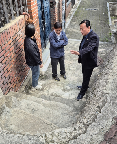 심재억 강북구의회 도시복지위원장은 지난 2025년 10월 21일, 송천동 내 파손된 계단이 있는 골목길(삼양로22길12 앞)을 강북구 도로관리과 담당자와 방문하고 시설 개선을 촉구했다.