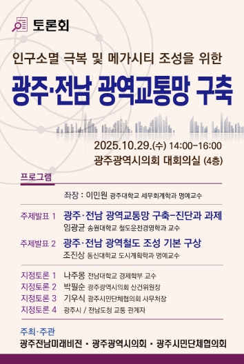 광주·전남의 인구소멸 위기와 수도권 집중에 대응하기 위한 '인구소멸 극복 및 메가시티 조성을 위한 광주·전남 광역교통망 구축' 토론회가 오는 10월 29일 오후 2시부터 4시까지 광주광역시의회 대회의실(4층)에서 열린다.