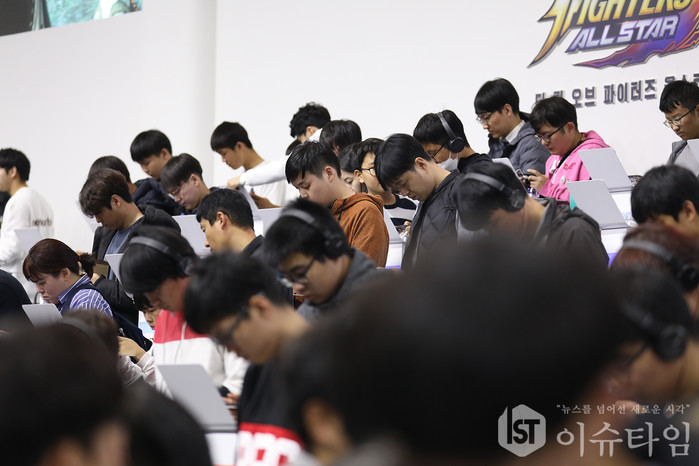 (이슈타임)이찬혁 기자='지스타 2018 (G-STAR)' 관람객들이 넷마블의 액션 RPG '더 킹 오브 파이터즈 올스타'의 사전 체험을 위해 부스에 참여하고 있다.
