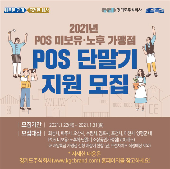 경기도와 경기도주식회사는 ‘공공배달 디지털 인프라구축 POS 미보유·노후 가맹점 단말기 보급 지원사업’에 참여할 소상공인의 신청을 받는다고 26일 밝혔다.