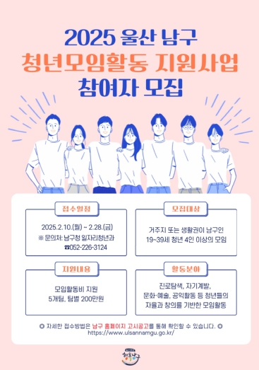 울산 남구 2025년 청년모임활동 지원사업 ‘남구청년, 이모저모’의 참여팀을 모집한다고 6일 밝혔다.