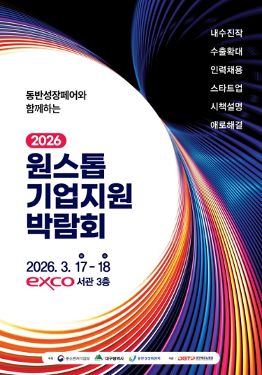 대구광역시는 지역기업의 지속 가능한 성장을 지원하기 위해 오는 3월 17일부터 18일까지 EXCO 서관 3층에서 열리는 ‘동반성장페어와 함께하는 2026 원스톱 기업지원박람회’ 참가기업을 모집한다.