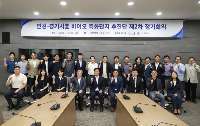 시흥시는 7월 9일 시청 글로벌센터에서 ‘인천-경기시흥 바이오 특화단지 추진단’ 제2차 정기회의를 개최했다. 이날 회의에는 경기도와 인천시를 비롯해 대학, 연구기관, 병원, 기업 관계자 등 40여 명이 참석해 특화단지 간 협력 방안과 공동 전략을 논의했다.