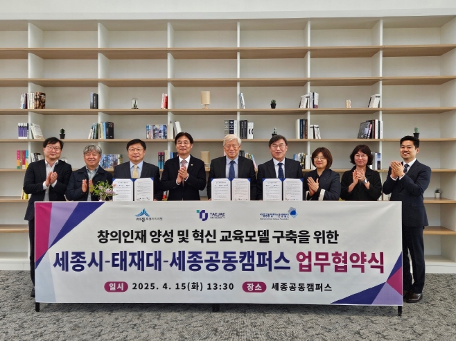 세종특별자치시가 15일 세종공동캠퍼스에서 태재대학교, 세종공동캠퍼스운영법인(이사장 한석수)과 창의인재 양성과 교육모델 구축을 위한 업무협약을 체결했다.