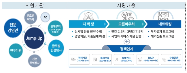 ‘도약(Jump-Up) 프로그램’은 우리 경제의 활력을 회복하고 역동성을 불어넣기 위해 금년부터 처음 시행되는 정책으로 분야별 전문가의 엄격하고 치열한 평가와 검증을 통해 유망 중소기업 100개사를 선발하여3년간 신사업·신시장 진출을 종합적·체계적 지원하는 사업이다.