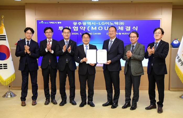 광주광역시와 LG이노텍은 13일 시청 비즈니스룸에서 ‘차량용 제어모듈 신규 생산라인 구축을 위한 투자협약’을 체결했다. 이번 협약은 2026년 새해 부강한 광주로의 힘찬 도약을 알리는 첫 신호탄이다.