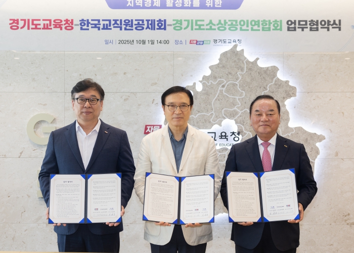 경기도교육청이 1일 남부청사에서 경기도소상공인연합회, 한국교직원공제회와 ‘지역경제 활성화를 위한 상생 업무협약’을 체결했다.