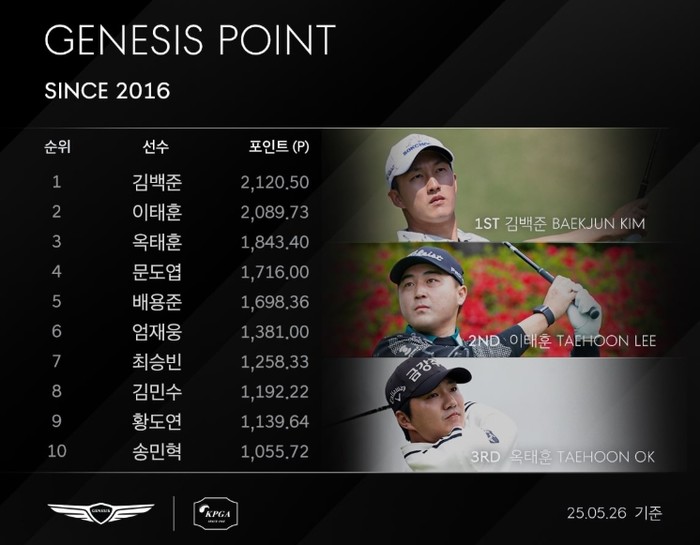 김백준은 개막전 ‘제20회 DB손해보험 프로미 오픈’ 우승으로 제네시스 포인트 1위에 등극한 이후 ‘2025 우리금융 챔피언십’, ‘제44회 GS칼텍스 매경오픈’, ‘KPGA 클래식’, “SK텔레콤 오픈’까지 5개 대회에서 총 2,120.50포인트를 획득했다.