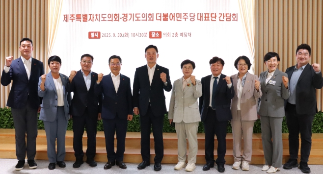 경기도의회 더불어민주당이 30일 예담채에서 교섭단체 운영현황 공유 및 상호 교류·협력 강화를 위해 경기도의회를 방문한 제주도의회 더불어민주당과 간담회를 진행했다.