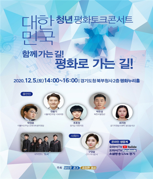 ‘함께 가는 길! 평화로 가는 길!’을 주제로 진행될 이번 평화토크콘서트는 평화정책에 청년들의 목소리를 반영하고 소통 기회를 확대하고자 경기도가 마련한 행사로, 코로나19 상황을 고려해 온라인 비대면 방식으로 진행된다.