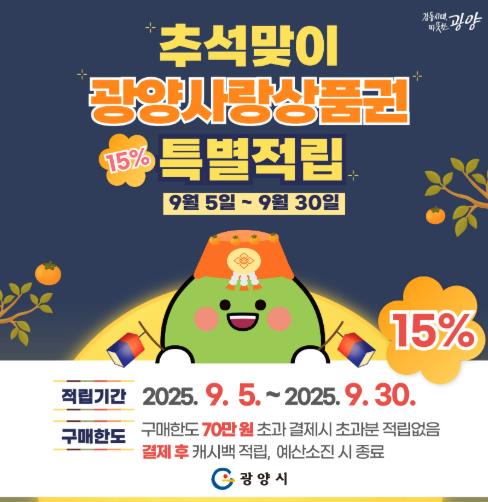 시는 기존 상품권 구매 시 연중 10% ‘후 캐시백’ 혜택을 제공했으나, 추석맞이 소비 확대를 위해 9월 한 달간 15%, 10월부터는 13% 특별 캐시백을 적용한다.