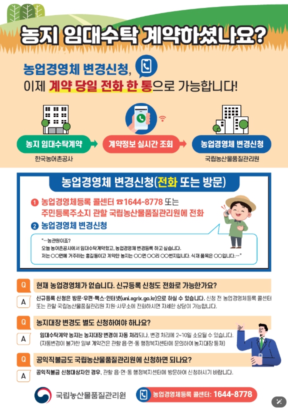 국립농산물품질관리원 농업경영체시스템과 한국농어촌공사 농지은행 시스템을 실시간 연계, 임대수탁계약 완료와 동시에 농업경영체 정보도 변경등록 처리