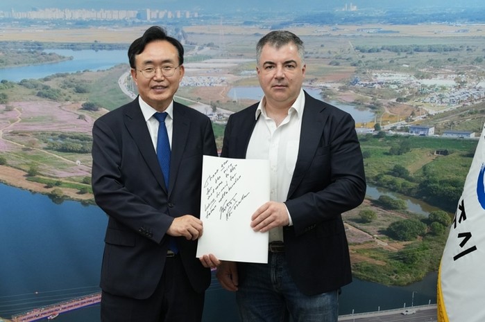 ‘나주글로벌에너지포럼 2025(NGEF 2025)’ 참가를 위해 나주를 방문한 2010년 노벨물리학상 수상자 콘스탄틴 노보셀로프 교수(싱가포르 국립대)가 16일 오후 나주시청을 방문해 윤병태 시장과 환담했다.
