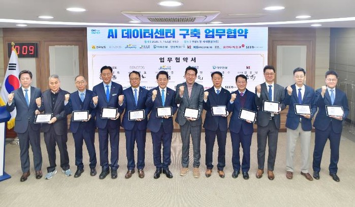군은 16일 전남도청에서 전라남도, ㈜베네포스, 케이티(KT), 대우건설, 탑솔라, 아이피에이(IPA), 케이지(KG)엔지니어링, 유진투자증권, 시드인베스트먼트 자산운용과 함께 ‘AI 데이터센터’ 구축 업무협약을 체결했다.