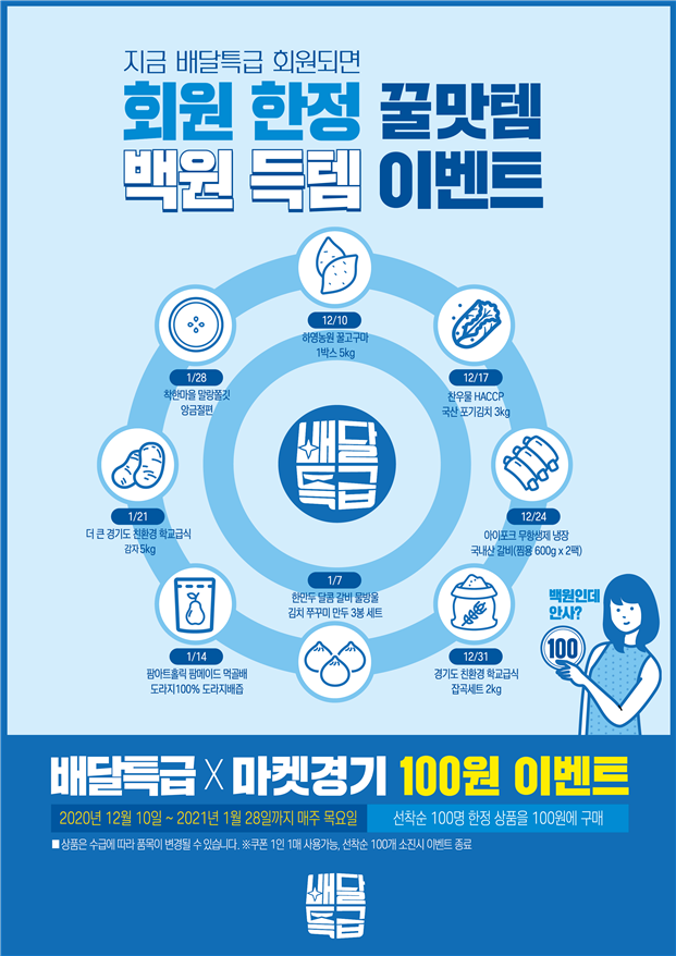 이번 이벤트는 경기도주식회사가 운영하는 ‘배달특급’과 경기농식품유통진흥원이 운영하는 ‘마켓경기’와 함께 마련된 행사로 친환경 농산물 및 다양한 먹거리를 선착순 100명에게 100원(배송료 포함)에 판매하는 행사다.