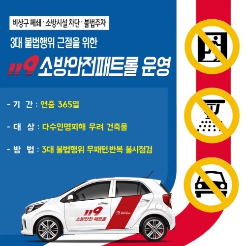 경기도북부소방재난본부(본부장 조인재)는 올해에도 ‘경기북부 119소방안전패트롤’을 통해 대형화재 및 인명피해의 주요 원인인 3대 불법행위(비상구 폐쇄, 소방시설 차단, 불법 주·정차)의 근절에 나선다.
