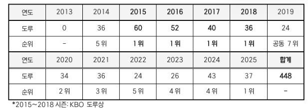 - KBO 리그 역대 5번째 450도루 달성 임박