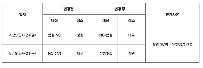 KBO는 4월 25일(금)~27일(일) 창원에서 개최 예정이던 삼성과 NC의 3연전과 8월 19일(화)~21일(목) 대구에서 개최 예정이던 NC와 삼성의 3연전의 경기 장소를 다음과 같이 변경했다.