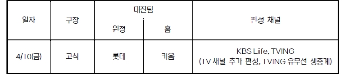 오는 4월 10일(금) 오후 6시 30분부터 고척에서 열리는 KBO 리그 롯데-키움의 경기가 KBS Life 채널에 편성돼 생중계될 예정이다.