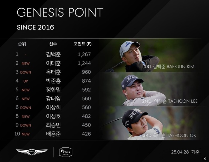한편 시즌 종료 후 제네시스 포인트 1위로 ‘제네시스 대상’을 차지한 선수에게는 보너스 상금 2억 원과 함께 제네시스 차량, KPGA 투어 시드 5년과 PGA투어 큐스쿨 최종전 직행 자격, DP월드투어 시드 1년이 주어진다.