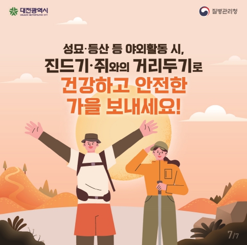 대전시는 성묘와 등산, 농작업 등 야외활동이 늘어나는 가을철을 맞아 시민들에게 진드기·설치류 매개 감염병 예방수칙 준수를 당부했다.