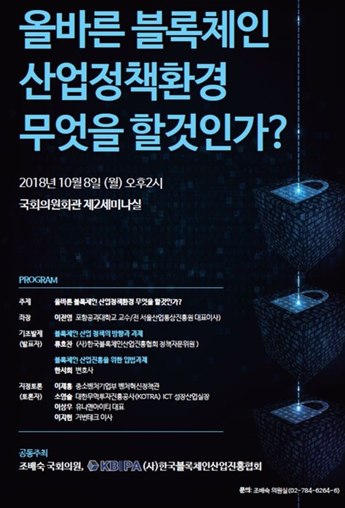 국회 산업통상자원중소벤처기업위원회 소속 조배숙 민주평화당 의원은 사단법인 한국블록체인산업진흥협회와 공동으로 8일 국회의원회관 제2세미나실에서 '올바른 블록체인산업 정책환경 무엇을 할 것인가?'를 주제로 토론회를 개최했다.