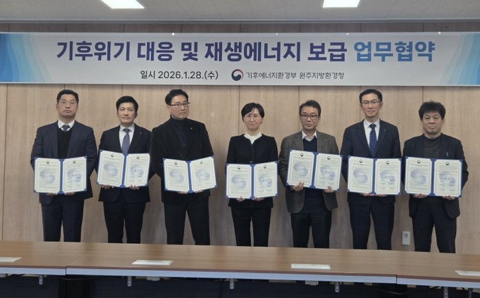 충북도는 28일 원주지방환경청, 강원특별자치도 및 에너지 공기관과 함께 기후위기 대응 역량을 강화하고 재생에너지의 안정적인 보급 확대를 위한 업무협약을 체결했다.