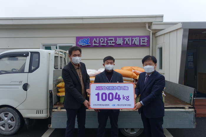 [전남=프레스뉴스] 강래성 기자= (사)신안군 친환경농업협회(회장 김석훈)는 따뜻한 마음을 담은 사랑의 친환경 쌀 1004kg을 (재)신안군복지재단(이사장 박균보)에 22일(금) 전달했다.
