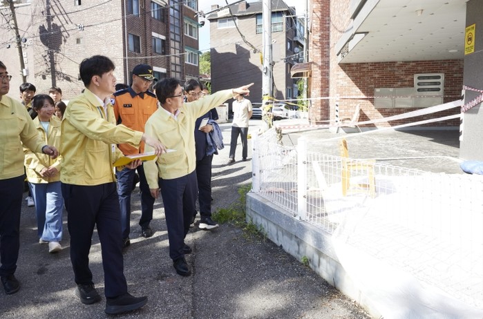 ▲ 15일 오후 수원 파장동에서 김동연 경기도지사가 옹벽 붕괴 우려 주택을 방문하여 점검하고 있다. |