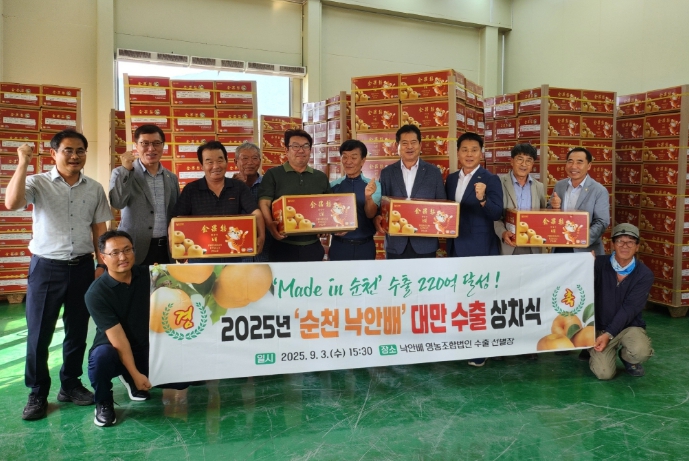 순천시는 3일 낙안배영농조합법인수출선별장에서 ‘2025년 순천 명품 낙안배 대만 수출 기념 상차식’을 개최했다고 밝혔다.