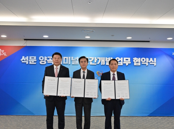 도는 20일 도청 상황실에서 김태흠 지사와 오성환 시장, 심장식 ㈜선광 회장, 이도희 ㈜선광 대표가 3100억원(민자, 1단계) 규모의 ‘석문 양곡터미널 민간개발 업무협약’을 체결했다고 밝혔다.