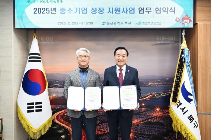울산 북구는 20일 구청장실에서 울산테크노파크와 2025년 중소기업 성장 지원사업 업무협약을 체결했다.