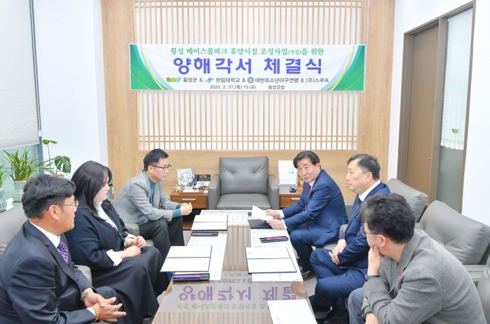 횡성군은 2월 27일 오후 3시 군수실에서 김명기 군수, 홍석민 한림대학교 기획처장, 이상근 대한유소년야구연맹 회장, 김예진 ㈜스쿠프 대표가 참석한 가운데 횡성 베이스볼파크 휴양시설 조성사업을 위한 양해각서를 체결했다.