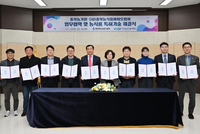 충북농업기술원은 20일 (사)충북농식품바이오협회(회장 정준영)와 충북 내 농식품 및 바이오 관련 기업과의 긴밀한 상호협력을 위한 업무협약과, 농식품 특허 기술 5건을 8개 업체에 이전하는 통상실시 체결식을 했다고 밝혔다.