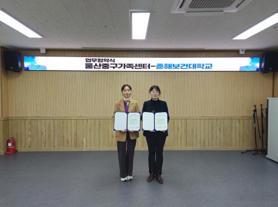 울산중구가족센터와 춘해보건대학교 글로벌케어과가 12월 10일 오후 2시 울산중구가족센터 다목적실에서‘산학 공동발전 지역 멘토기관’ 업무협약을 체결했다.