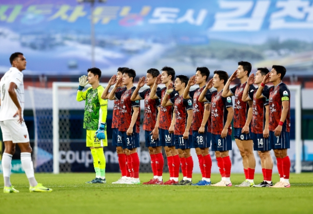 김천상무는 호국보훈의 달 홈경기를 맞아 ‘DMZ 목함지뢰 폭발사건 영웅’ 하재헌 중사의 시축으로 국군 영웅을 기억했다. 선수들은 호국보훈 유니폼을 착용하며 나라를 위해 헌신한 순국선열과 호국영령의 정신을 가슴에 새기며 경기를 시작했다.