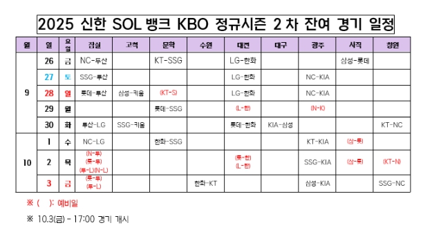 KBO는 26일(금) 2025 신한 SOL뱅크 KBO 정규시즌 2차 잔여 경기 일정을 확정했다.
