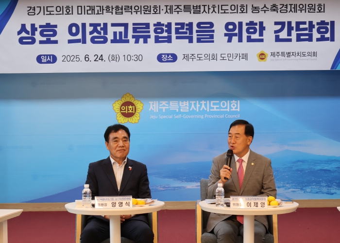 둘째 날에는 제주특별자치도의회 농수축경제위원회를 방문해 상호 교류와우호 협력 증진을 위한 간담회를 가졌다. 이 자리에서는 경제위기 속 자영업자의 어려운 현실, 지역화폐 ‘탐나는전’ 인센티브 정책, 지역 간 특산물 협업 방안, AI 디지털 전환 대응 등 농수축산업에서 첨단산업에 이르는 다양한 현안을 공유하고, 경기도와 제주특별자치도가 직면한 공통 과제와 상호 보완적 협력 방향을 함께 모색했다. 양 위원회는 앞으로도 지속적인 교류와 협력을 이어가며 지역 간 상생과 경제 회복에 힘을 보태기로 뜻을 모았다.