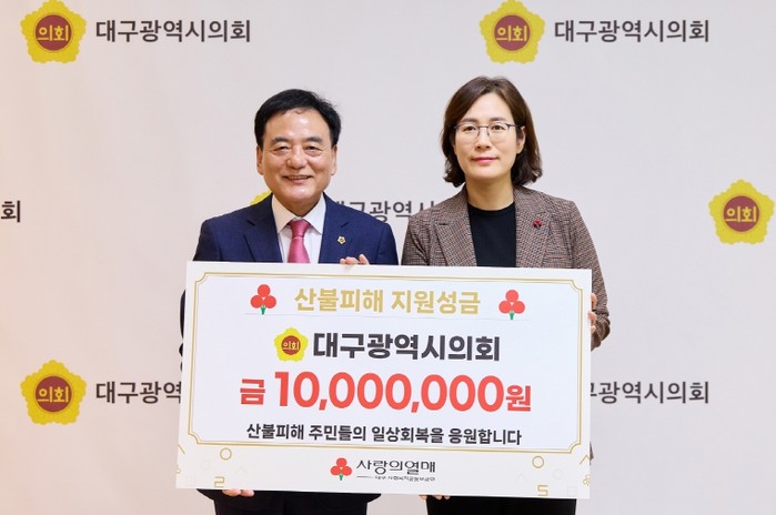 대구광역시의회는 영남지역 산불피해 지역 복구 및 이재민 지원을 위해 대구시의원과 직원들이 자율적으로 모금한 성금 1천만원을 4월 11일 14시, 시의회 접견실에서 대구 사회복지공동모금회에 전달했다.