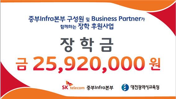 이번 장학금은 2015년 대전시교육청과 SK텔레콤중부Infra본부의 업무협약의 일환으로, 2016년~2020년 5년간 1억2000만 원의 장학금을 지원하기로 했으며, 올해에는 총 43교(초 24교, 중 14교, 고 5교) 48명 중 초등학생은 50만 원, 중⸱고등학생은 60만 원씩 지원될 예정이다.
