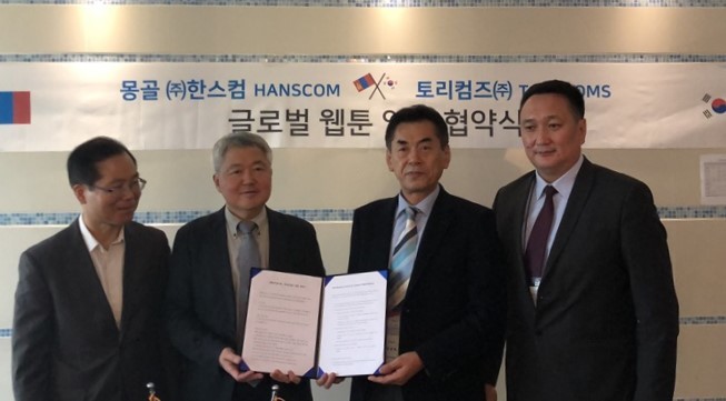 글로벌 웹툰 제작 회사인 토리컴즈 주식회사는 15일 몽골 HANSCOM과 `웹툰 플랫폼 및 웹툰 작가 및 웹툰 PD 육성을 위한 ICT MOU`를 맺었다.